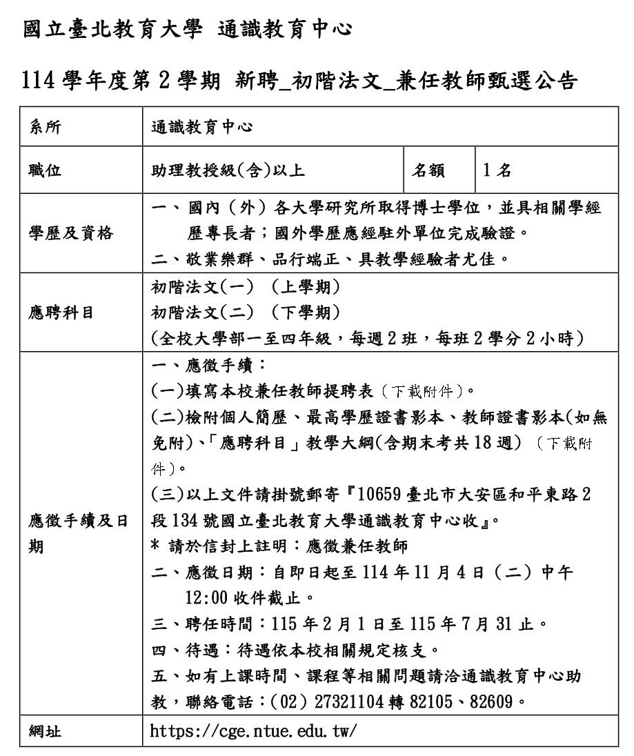 國立臺北教育大學通識教育中心114學年度第2學期新聘_初階法文_兼任教師甄選公告(收件至11月4日中午截止)