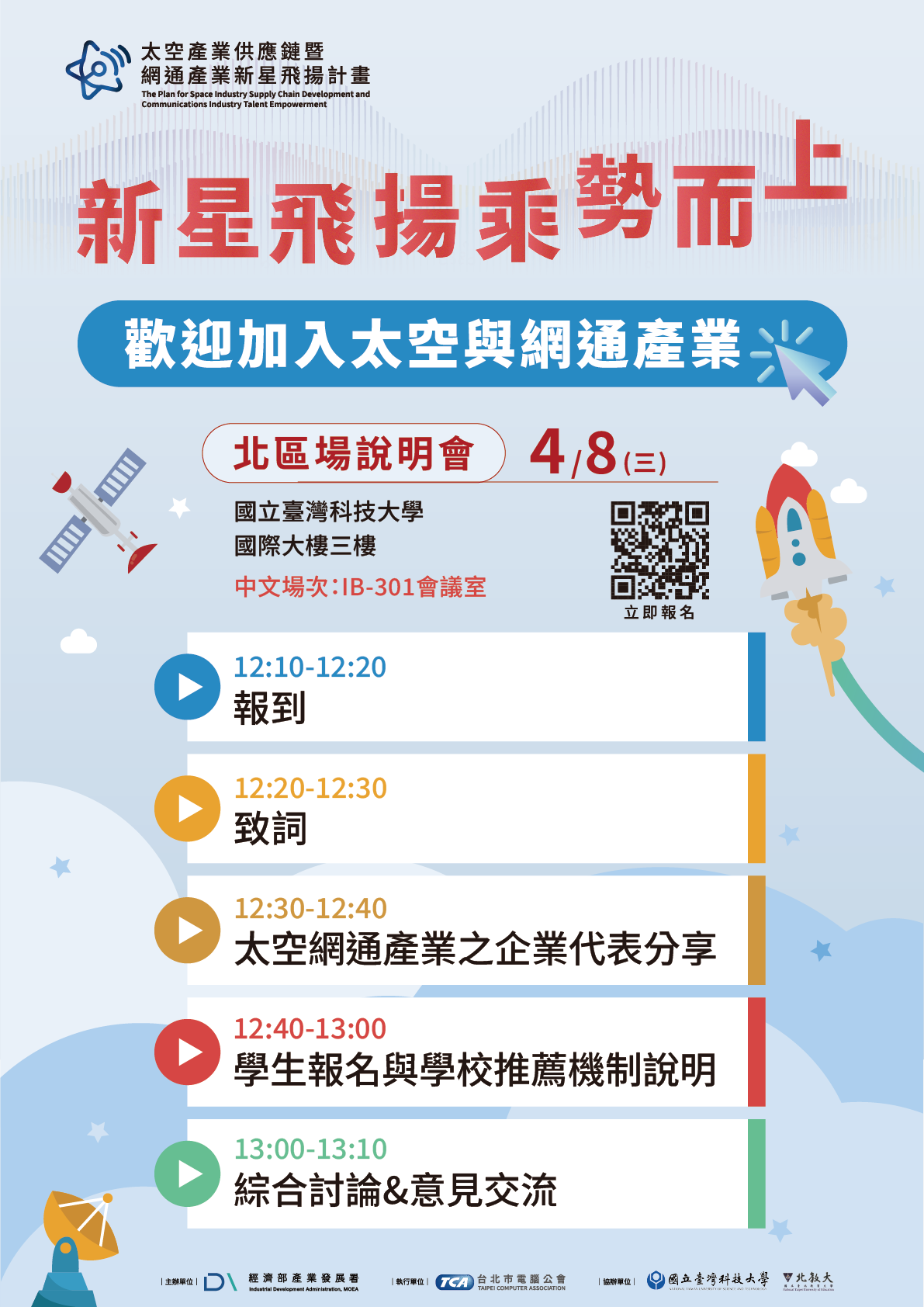 ✨產學合作最強機會來了~經濟部產發署「太空產業供應鏈暨網通產業新星飛揚計畫」【北區場大專校院申請說明會】限額報名中! 今年暑假直接前進產業第一線!