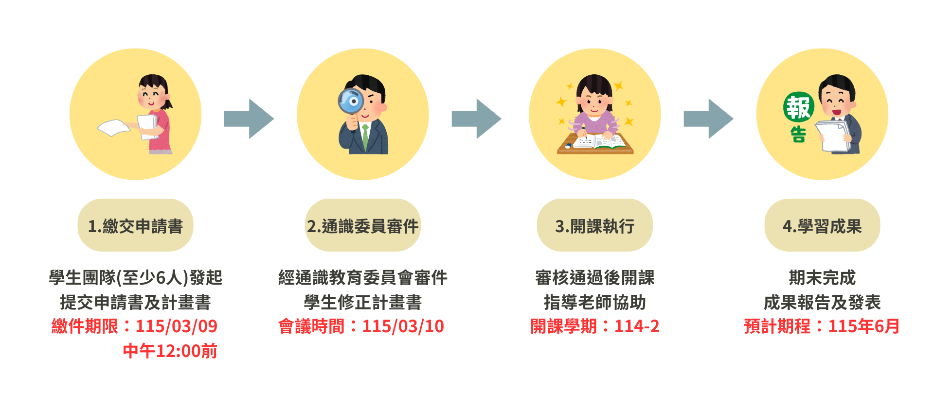 課程內容須非既有通識課程,並以跨域學習及議題導向為原則。