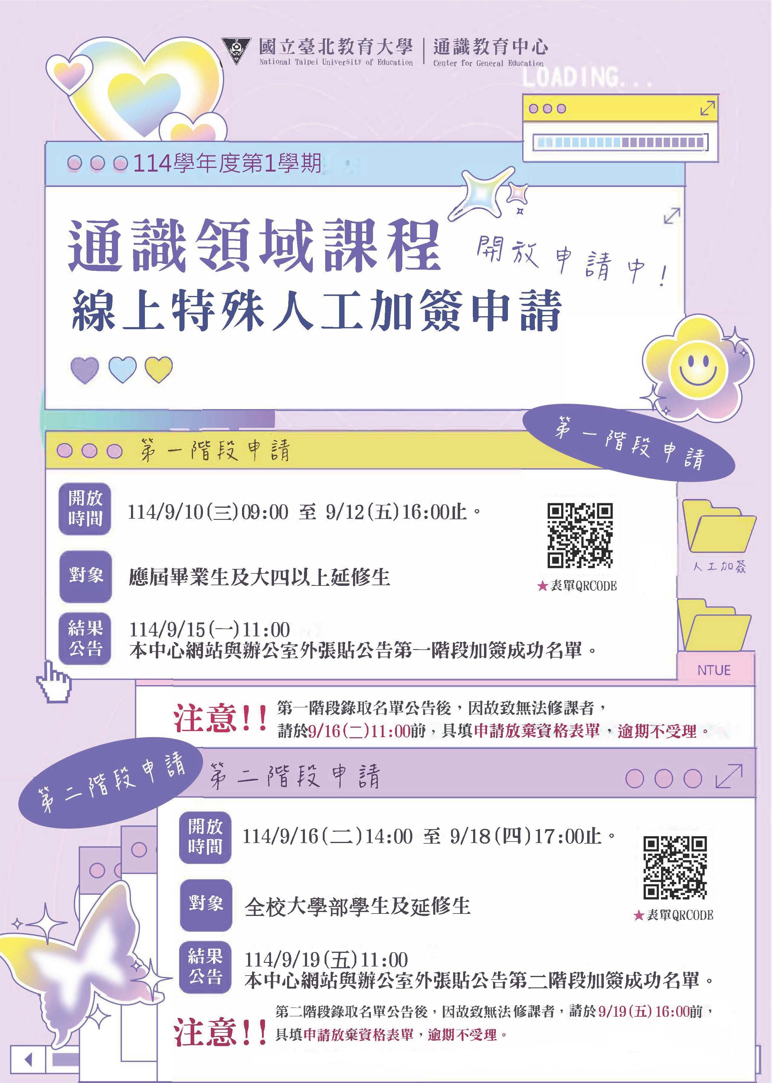 選課結果公告:114/9/19(五)上午11:00於通識教育中心網站最新消息公告第二階段已成功加簽名單。