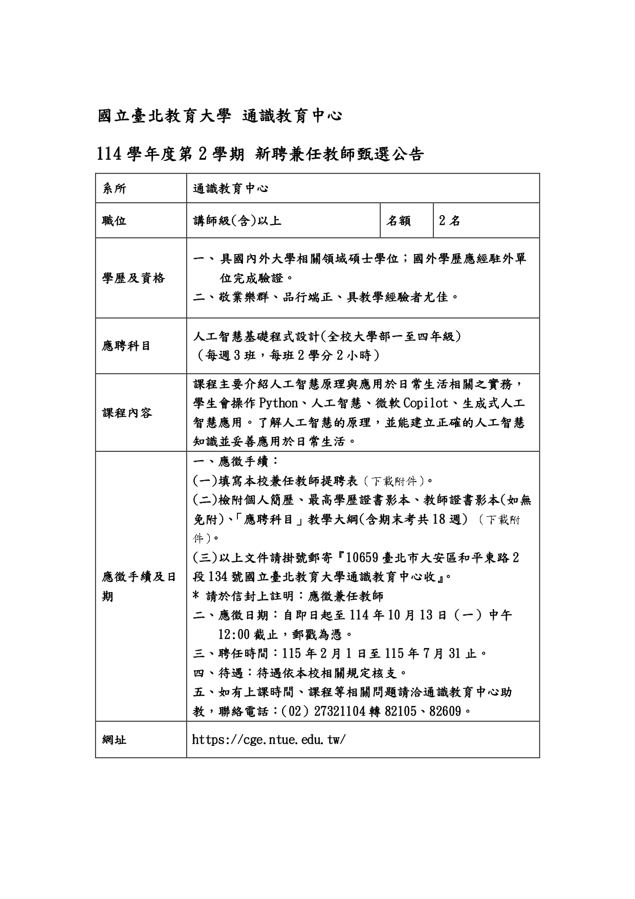 國立臺北教育大學通識教育中心114學年度第2學期新聘_人工智慧基礎程式設計_兼任教師甄選公告(延長公告,收件至10月13日中午截止)