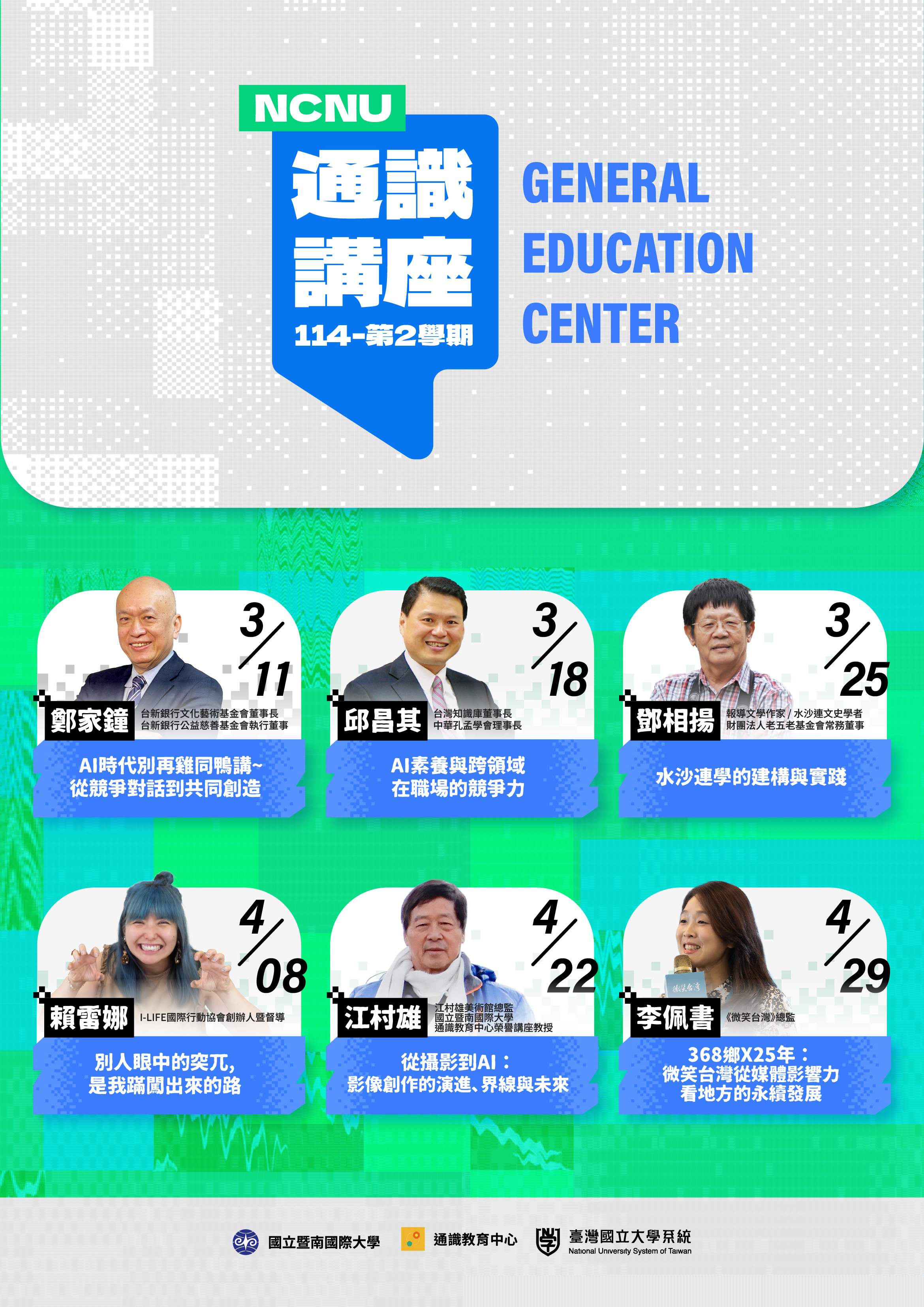一、114學年度第2學期暨南國際大學將舉辦6場專題講座,演講資訊如下,請參閱活動網址及海報:https://nust.edu.tw/forum.php。